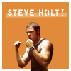 Description: Helo from BSG showing off those arms. Bright orange background, text "Steve Holt!" à la Arrested Development.