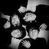Description: Black-and-white photo of all of the Beatles lying in a circle, their heads together.