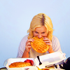 Description: Leslie Knope from Parks & Recreation, biting into her favorite JJ's waffles that may be bigger than her head.